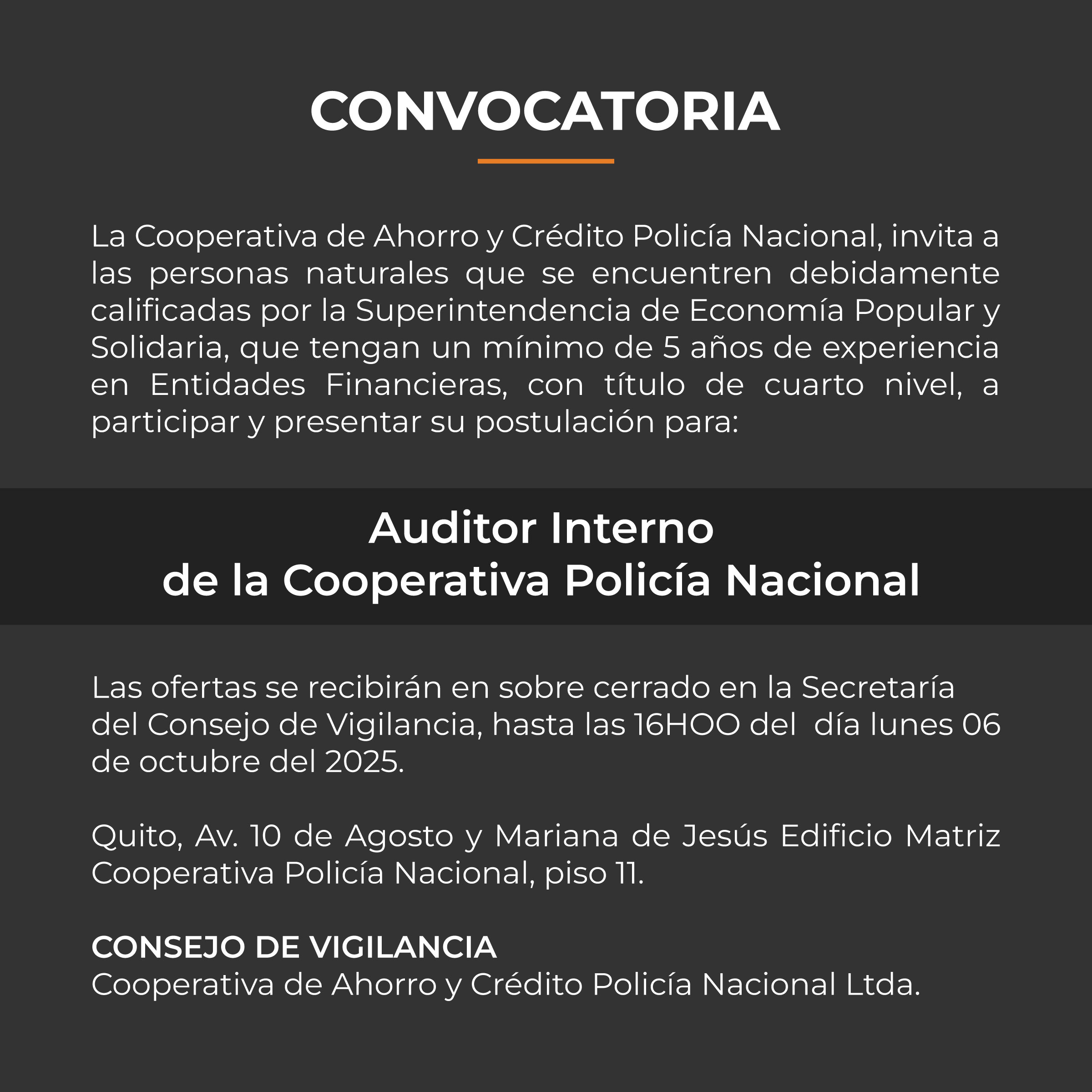 Cooperativa Policía Nacional es una empresa privada, perteneciente al sector popular y solidario, nació el 29 de junio de 1976, gracias al sueño común de un grupo de 35 damas y caballeros de la paz, con el objetivo de ayudar económicamente a sus compañeros Policías a través de todos los beneficios que una entidad financiera cooperativista puede ofrecer. En los últimos 10 años hemos ampliado paulatinamente nuestros segmentos de mercado, primero ofreciendo nuestros productos financieros también a los familiares de Policías a través de la famosa campaña mediática “Todos quieren un Policía en su familia”, luego lanzamos nuestro primer producto para todo público “Inversiones a Plazo Fijo", que hasta la fecha es un éxito gracias a la seguridad de nuestra entidad y en la actualidad tenemos productos, servicios y beneficios financieros altamente competitivos para todo público.